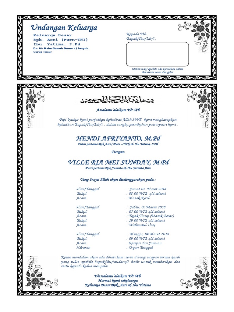 Kelurahan pilang selatan kecamatan laren. Surat undangan non resmi adalah surat undangan yang dibuat perseorangan atau kelompok untuk mengundang seseorang dalam kegiatan yang tidak formal seperti undangan pernikahan, undangan sukuran dll. Dinas pendidikan kebudayaan pemuda dan olah raga. Ada dua jenis surat undangan yaitu surat undangan tidak resmi dan resmi. Pengertian surat undangan tidak resmi.